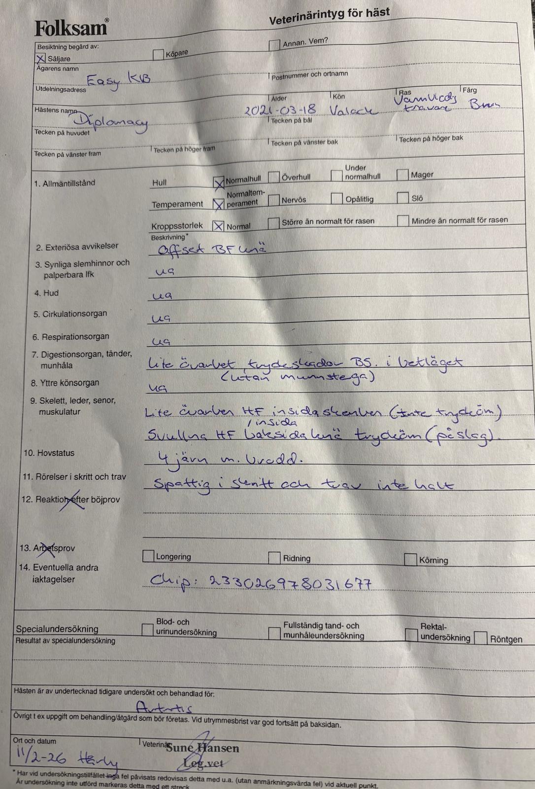 Mattias Djuse: ”Diplomacy är snäll i all hantering, kan vara lite framåt i körning. Han har fått dålig utdelning i loppen på sistone men är i full tävlingsform så det är bara att anmäla till lopp.”