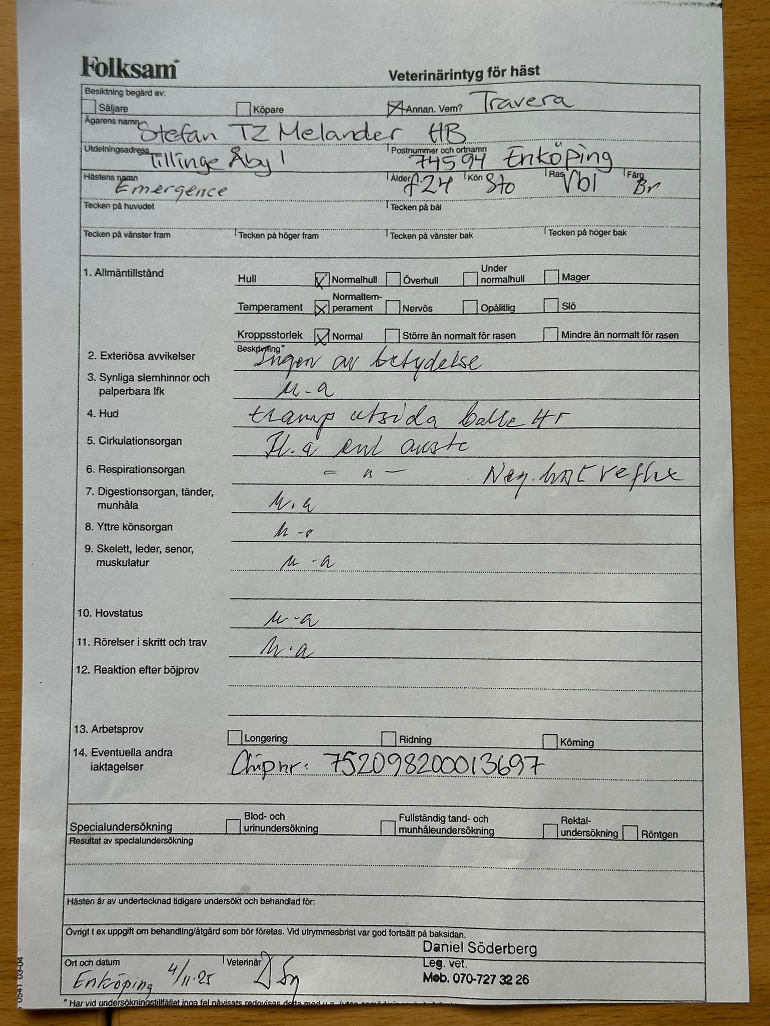 Emergence är ett 1-årigt sto efter Sprintermästaren Uncle Lasse, far till sex svenskfödda miljonärer - däribland montéspecialisten Ninepoints Lasse och Kriterietrean Ante la Roque. Mormor Prada Hall tjänade över 1,8 miljoner kronor och har i aveln lämnat bland andra Samson (559.500 SEK) och Localizer (455.377 SEK).