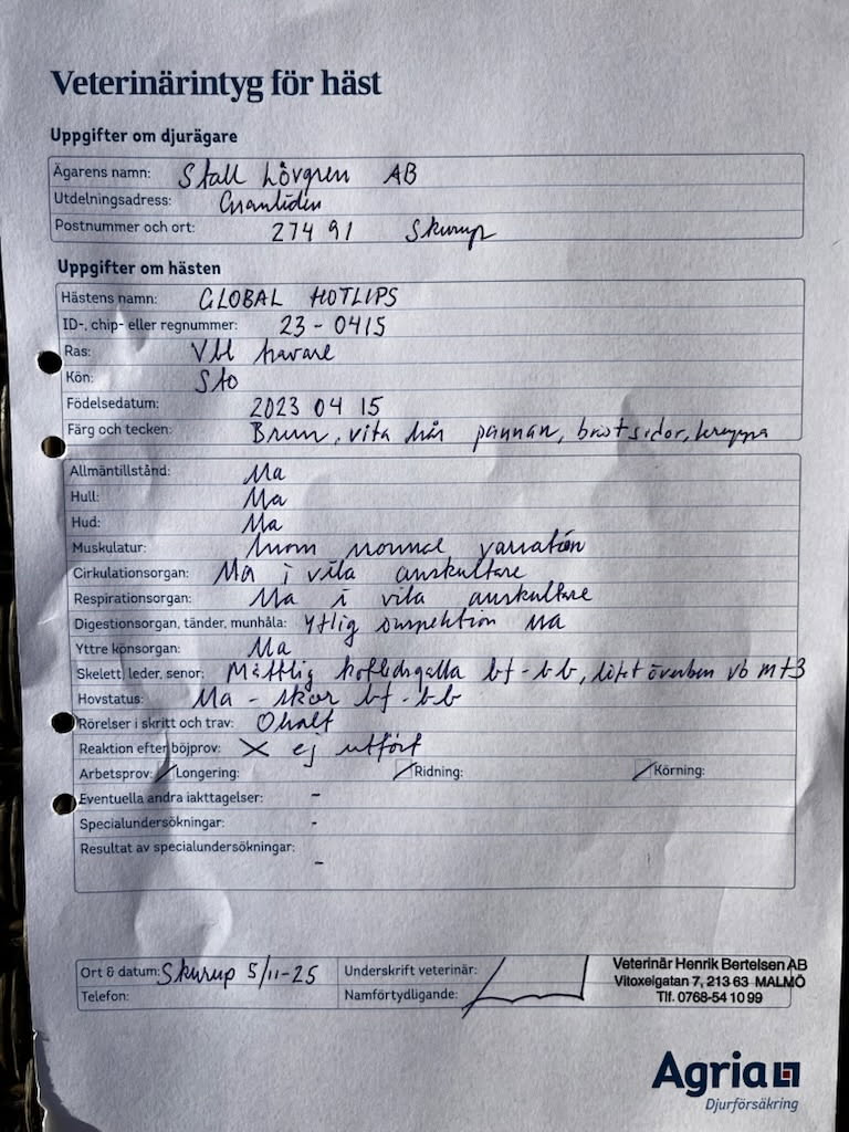 Joakim Lövgren: “Global Hotlips är normalstor, mycket snäll att arbeta med och passar även som amatörhäst. Hon har lagt många mil i grundträning och har som snabbast gått i 1.35-tempo. Säljes på grund av platsbrist.”