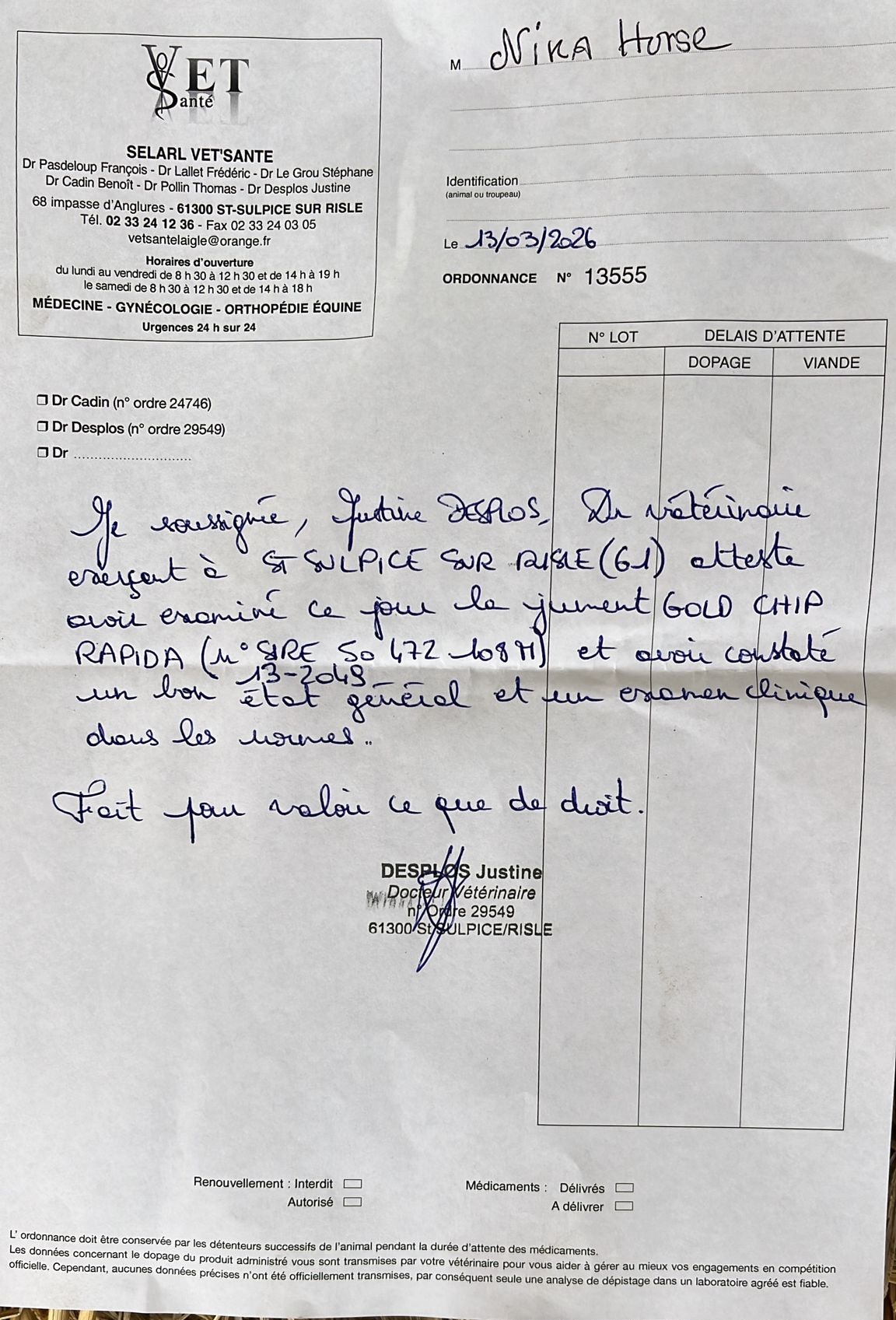 Notera att veterinärintyget är från 13 mars.