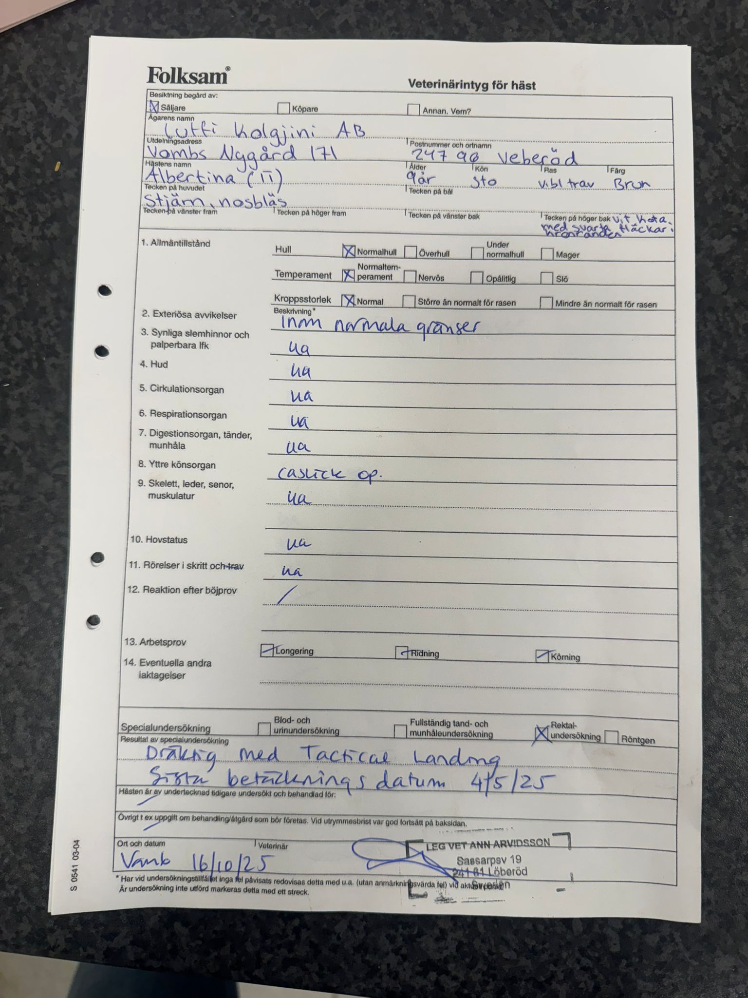 Albertina har föl vid sidan och står fritt på säljarens bekostnad till årets föl är avskiljt, detta sker i mitten av november.