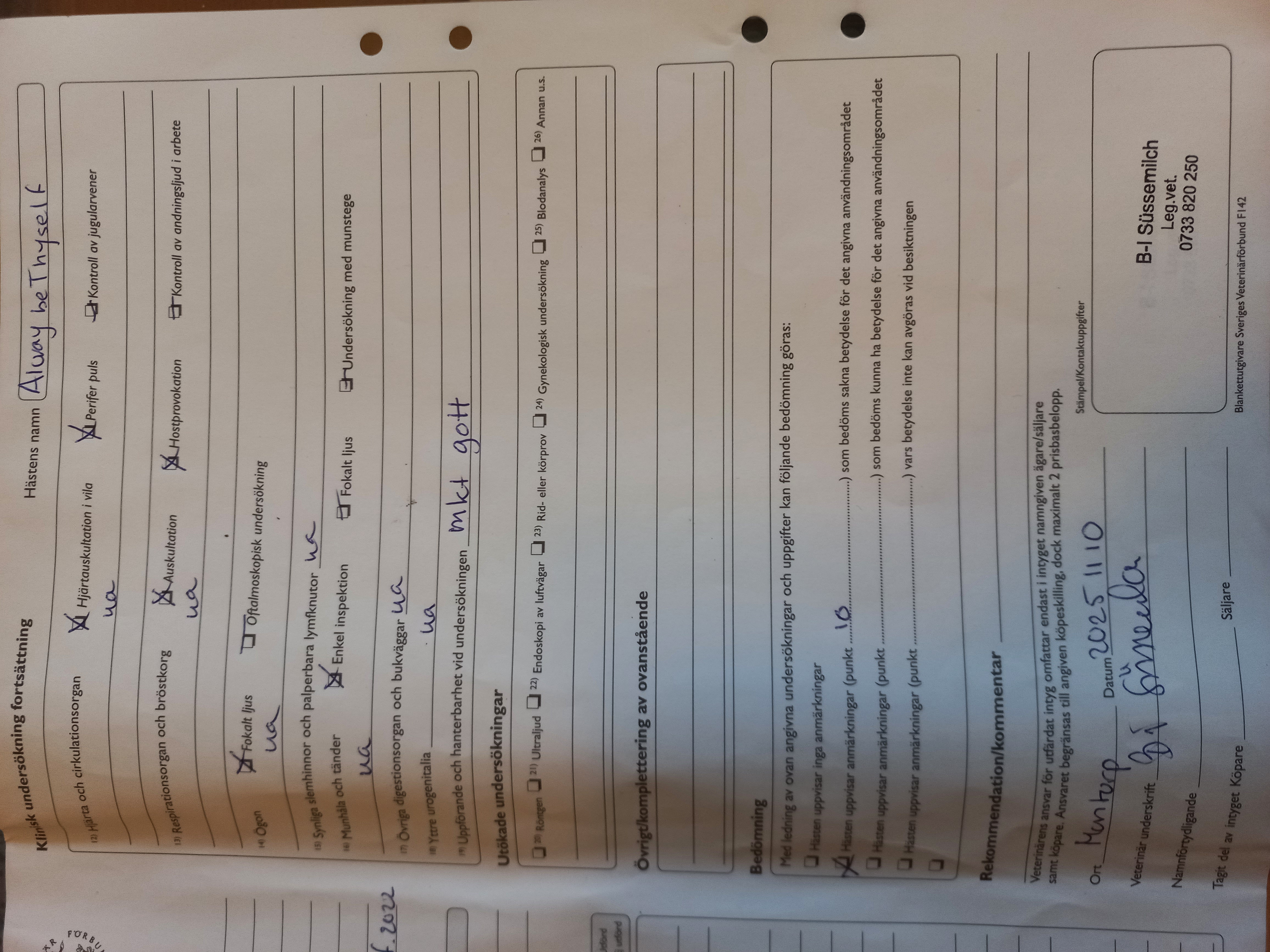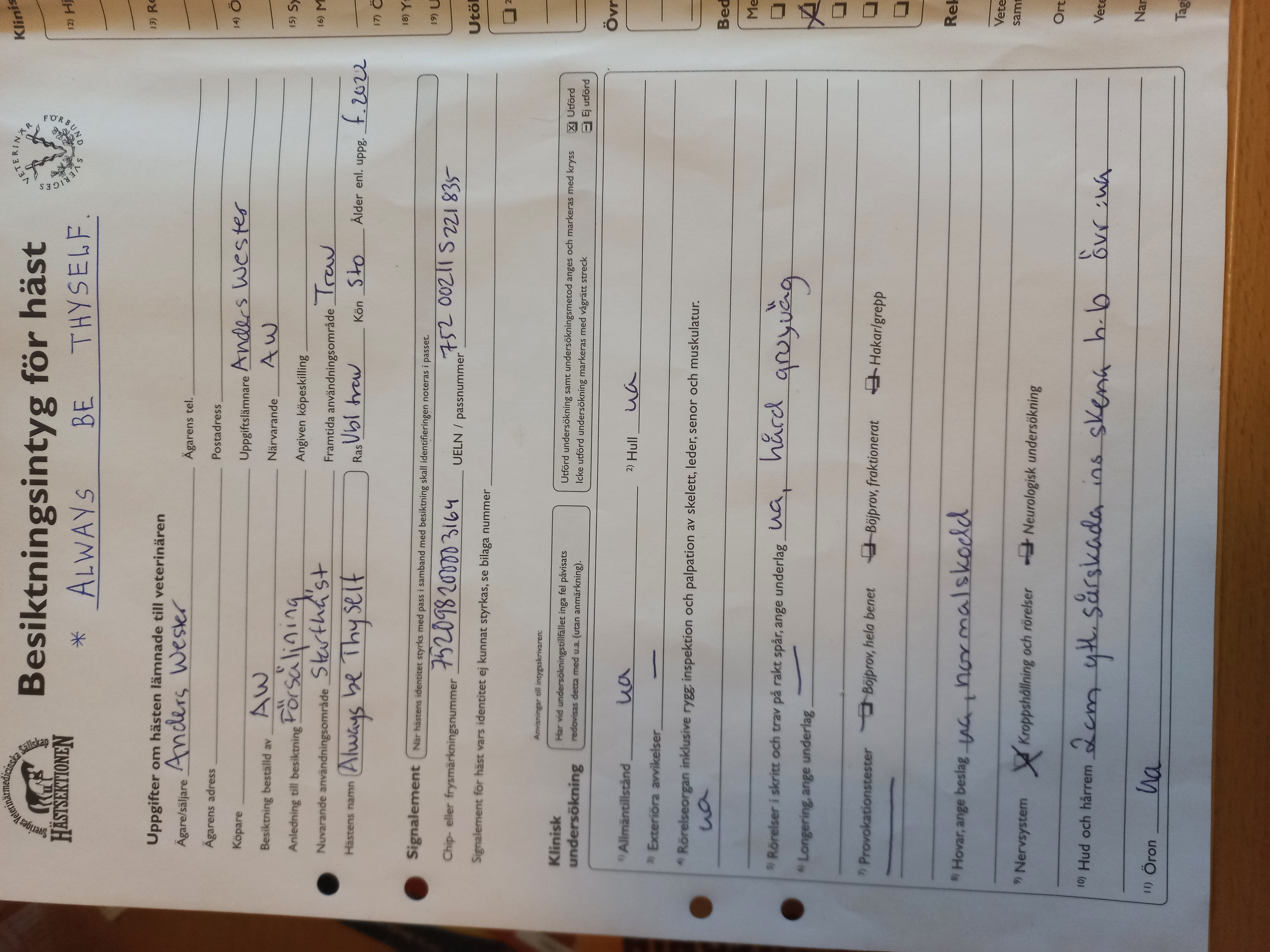 Always har ej behandlats för ledskador (aldrig infiltrerats med varken tuppkam eller cortison) och är helt utan fysiska skavanker. Hon är snäll i all hantering, att sela på, vid körning (kan även köras av orutinerad kusk), lätt att sko, och kan gå med vilket annat sto som helst. Bra temperament, alltid lugn, snäll, positiv, och lätt att hantera. Lätt att köra, tar aldrig i, lätt på bettet. 100% travsäker (enbart galopp vid grov störning, eller kusk-fel), startsnabb, båda vid volt- och bil-start. Lite bättra utan framskor. Aldrig ridtränats, aldrig tränat i djupt sand, och aldrig med tryckvagn, aldrig gått med jänkervagn eller norskt. Utan sårskadan hade hon startat på, och hon är startklar. Stort potential som fölsto (fin exteriör, och kanon-stam) på sikt. Säljes på grund av mina fysiska skavanker (68 år), och ytterligare 5 träningshästar står på kö."