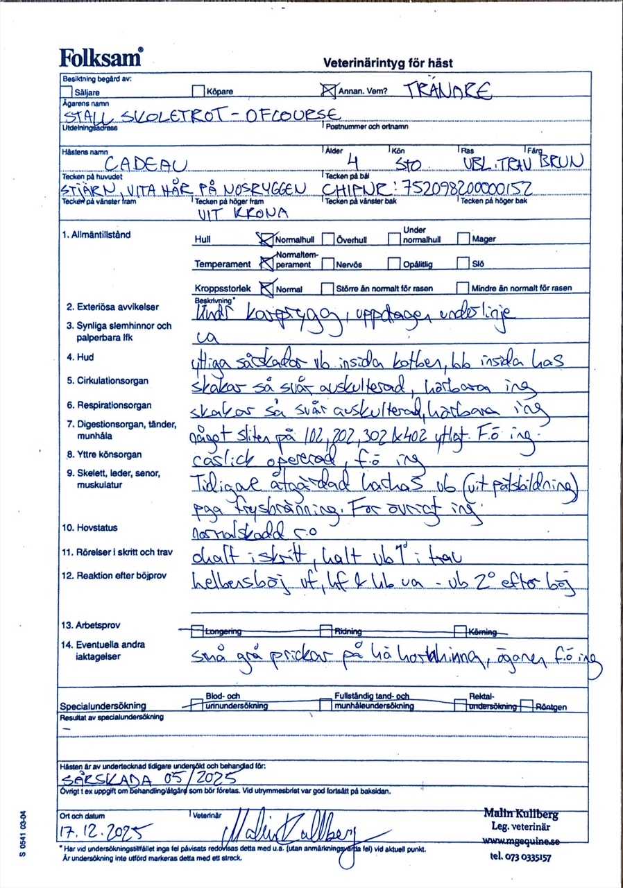 Owner statement: "Cadeau har aldrig vunnit, men gör sitt bästa i varje start. I oktober satt hon fast som trea i Courant-serien på Solvalla, och i augusti blev hon trea i V75 på Mantorp. Hon är snäll, travsäker och mycket lätt att hantera – en perfekt amatörhäst eller för en ungdom som vill börja köra lopp. Hon har ett perfekt stolopp under 345 000 kr på Åby den 1 januari."