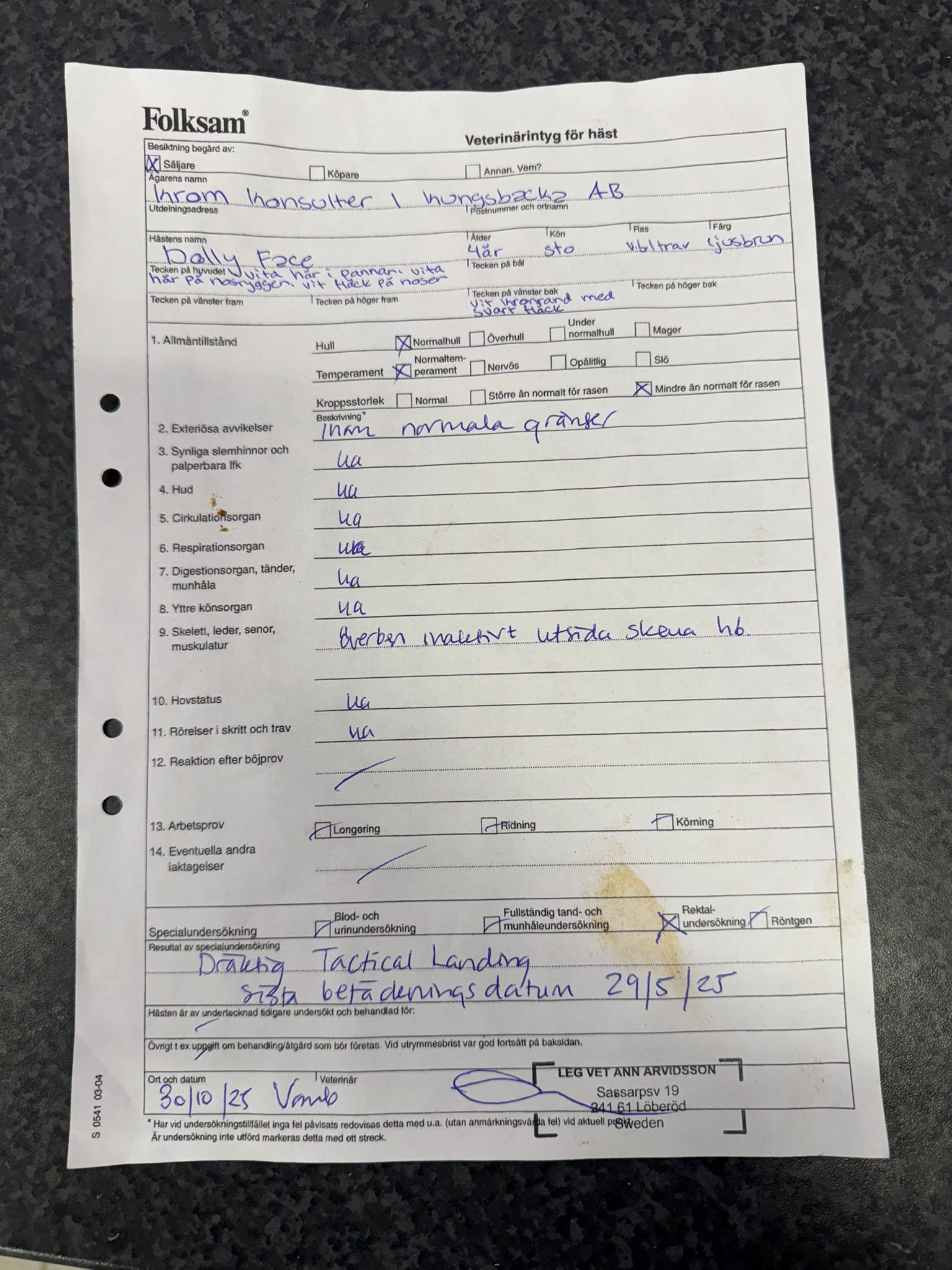 Dolly Face är dräktig med Tactical Landing, beräknat földatum 2026-04-29. Levande fölavgift på $20,000 betalas av köparen.