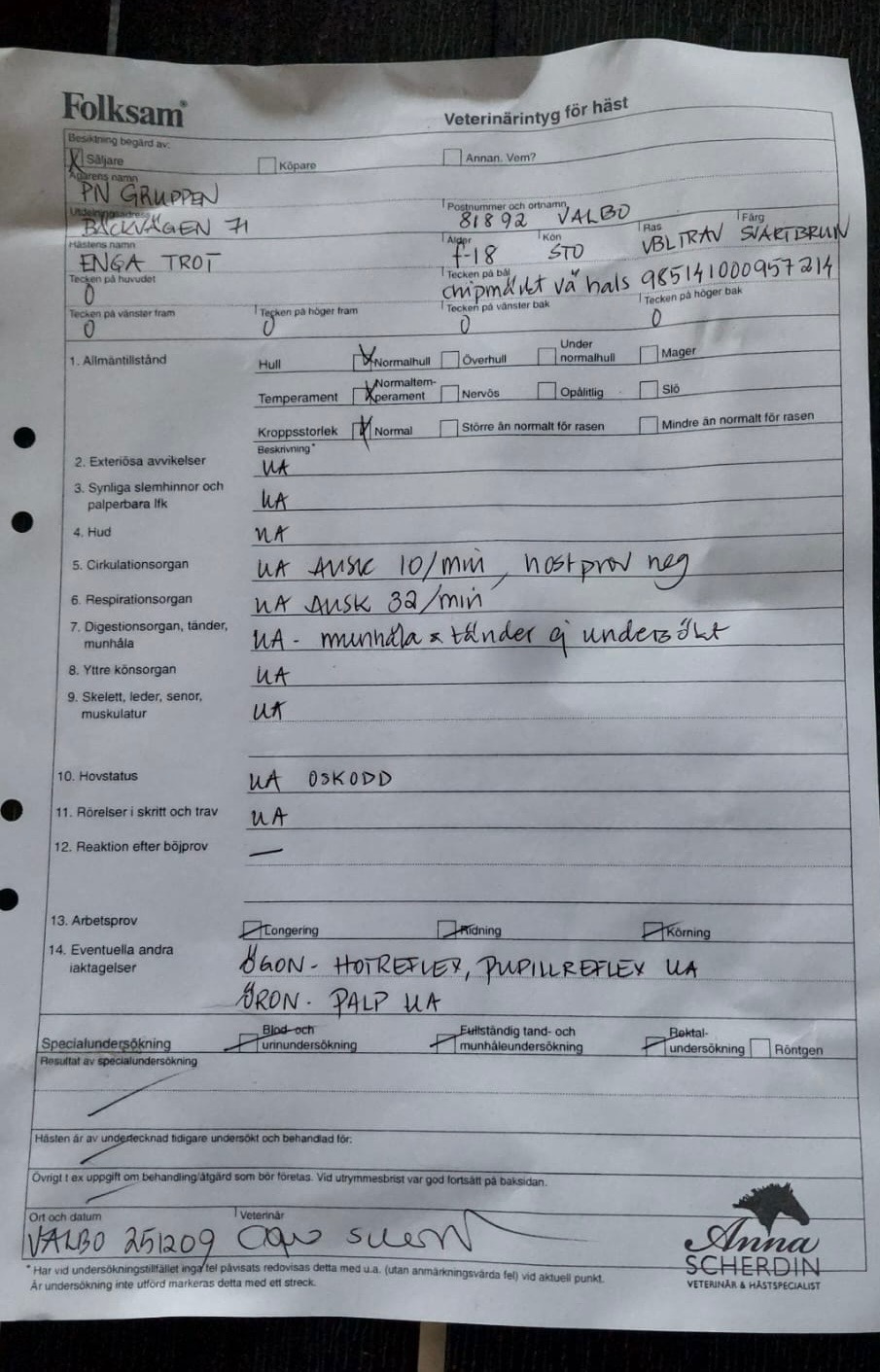 Emelie Öhman: "Enga Trot är snäll och okomplicerad i all hantering, körning och ridning. Hon blev även dräktig på första försöket. Hennes första avkomma e. Justice ser mycket fin ut. Finns att se vid intresse. Ej inseminerad i år, kan alltså att starta avelssäsongen tidigt nästa år."