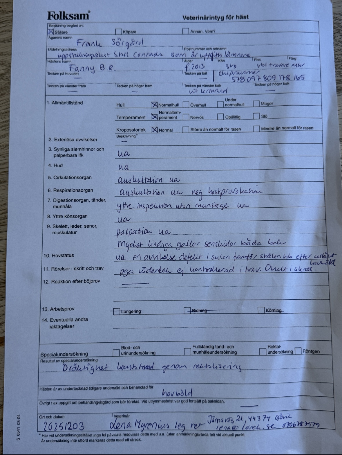 Fanny B.R. är dräktig med Venerate - Broline International, beräknat földatum 2026-06-30. Levande fölavgift på 50.000 SEK betalas av köparen.
