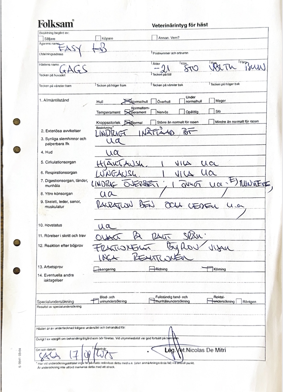Jörgen Westholm: "Gags är en fin travare som inte fått till det. Känns som hon har flera växlar kvar att visa upp på tävlingsbanan & bör också vara intressant som framtida avelssto. Har fått vila under sommaren och behöver en träningsperiod innan hon är redo för start. Snäll i all hantering samt körning, trafiksäker. Varit skadefri hela tiden hos oss."