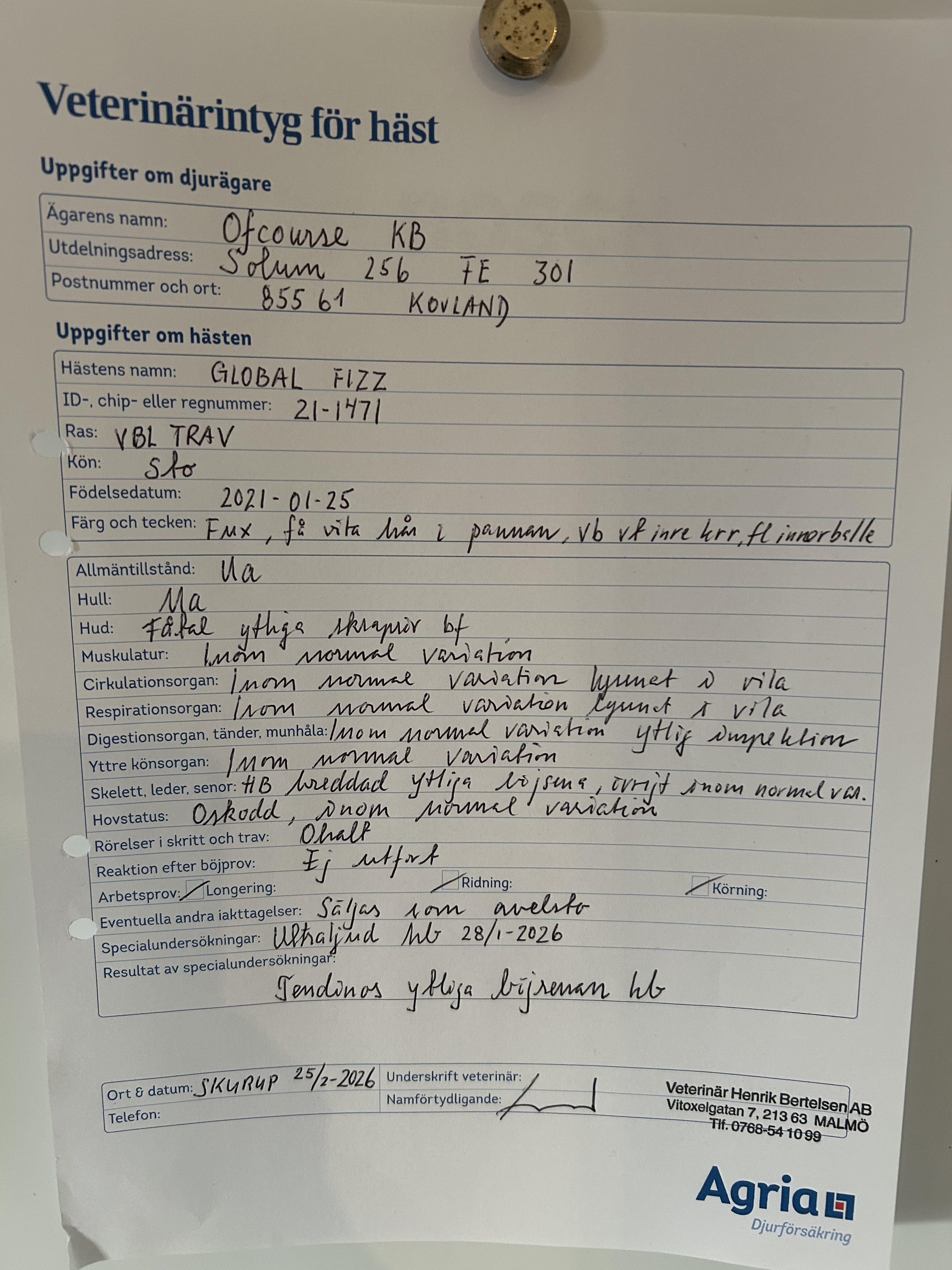 Joakim Lövgren: ”Global Fizz har drabbats av en senskada. Säljes som fölsto. En löpärlig märr som har rejäl härstamning. Både mor och morbror vann Derbyt!”