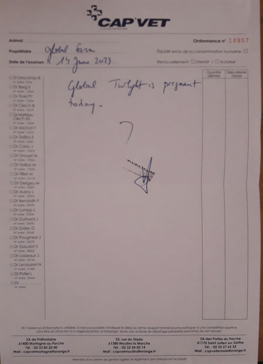 Global Twilight är dräktig med Donato Hanover och beräknat földatum är 17 april 2024. Levande fölavgiften betalas av köparen, vilket är 50.000 SEK.