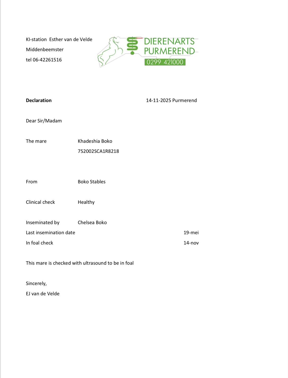 Khadeshia Boko (CA) är dräktig med Chelsea Boko. Levande fölavgiften 2026 a € 5.750,- ex VAT INGÅR! Beräknat földatum är 19 april 2026.