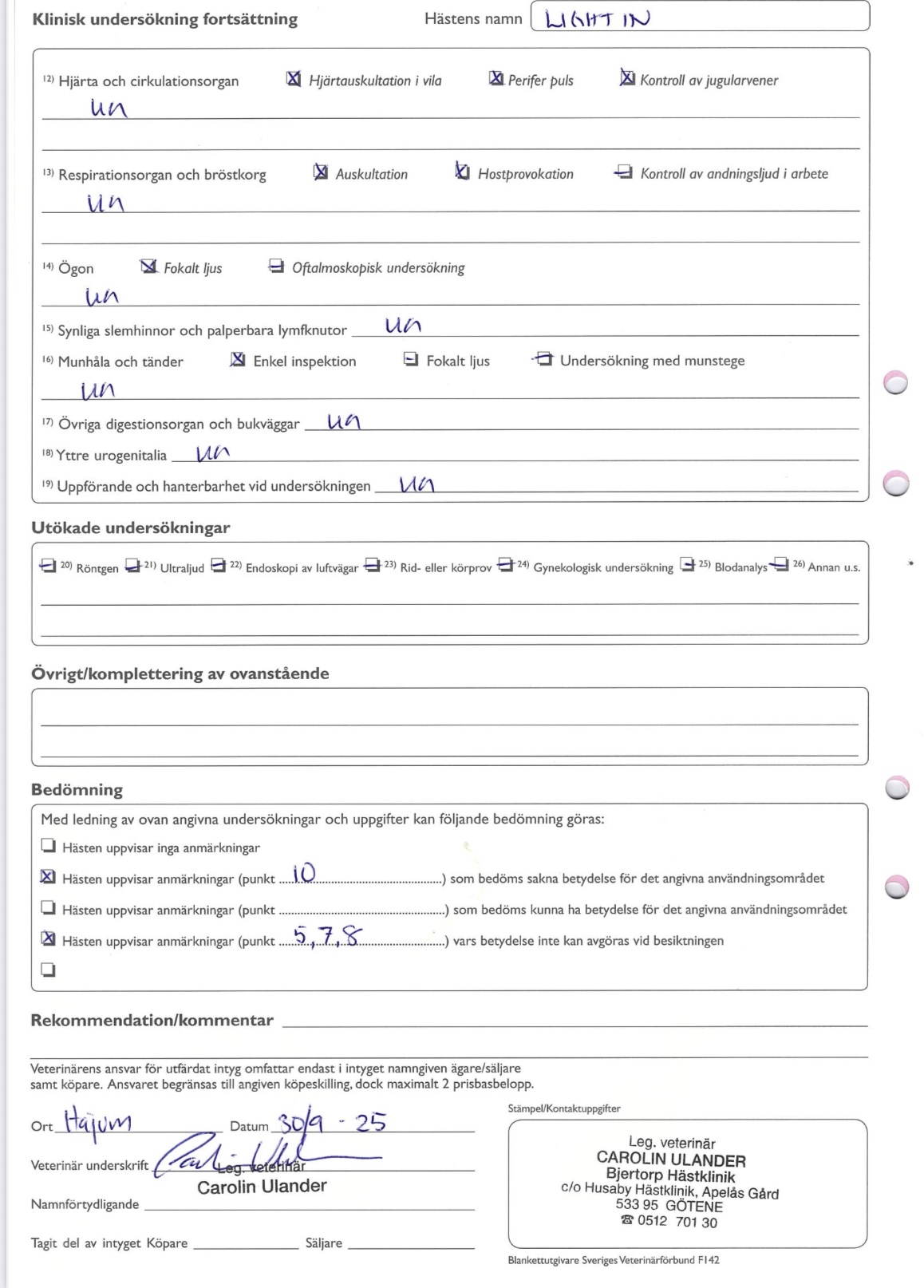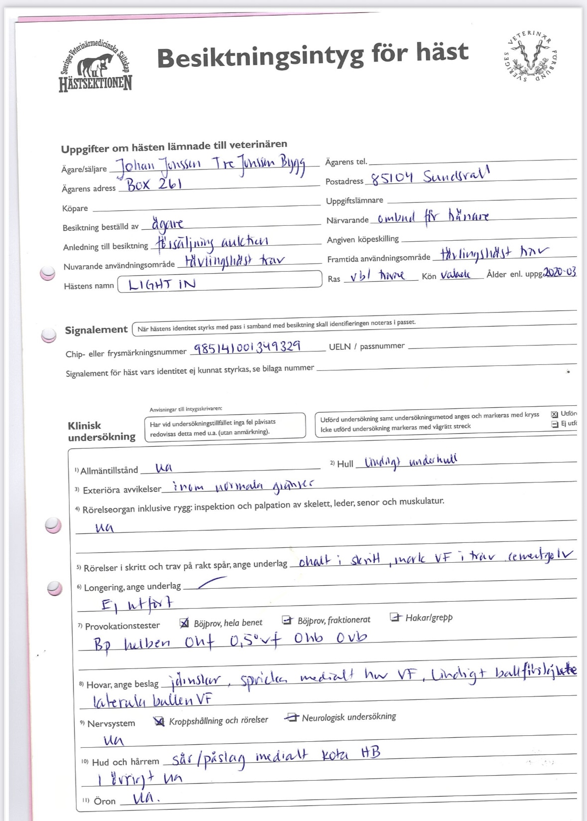 Robert Bergh: ”Light In har tävlat framgångsrikt på V75 i år och han fortsätter utvecklas hela tiden i sin stora kropp. Finns även fler växlar att dra, bland annat urryckare m.m. Trimmas nu för V75-finalen på Solvalla 11 oktober. Är han betald före 9 oktober så tillfaller eventuella prispengar från finalen 11 oktober köparen.”