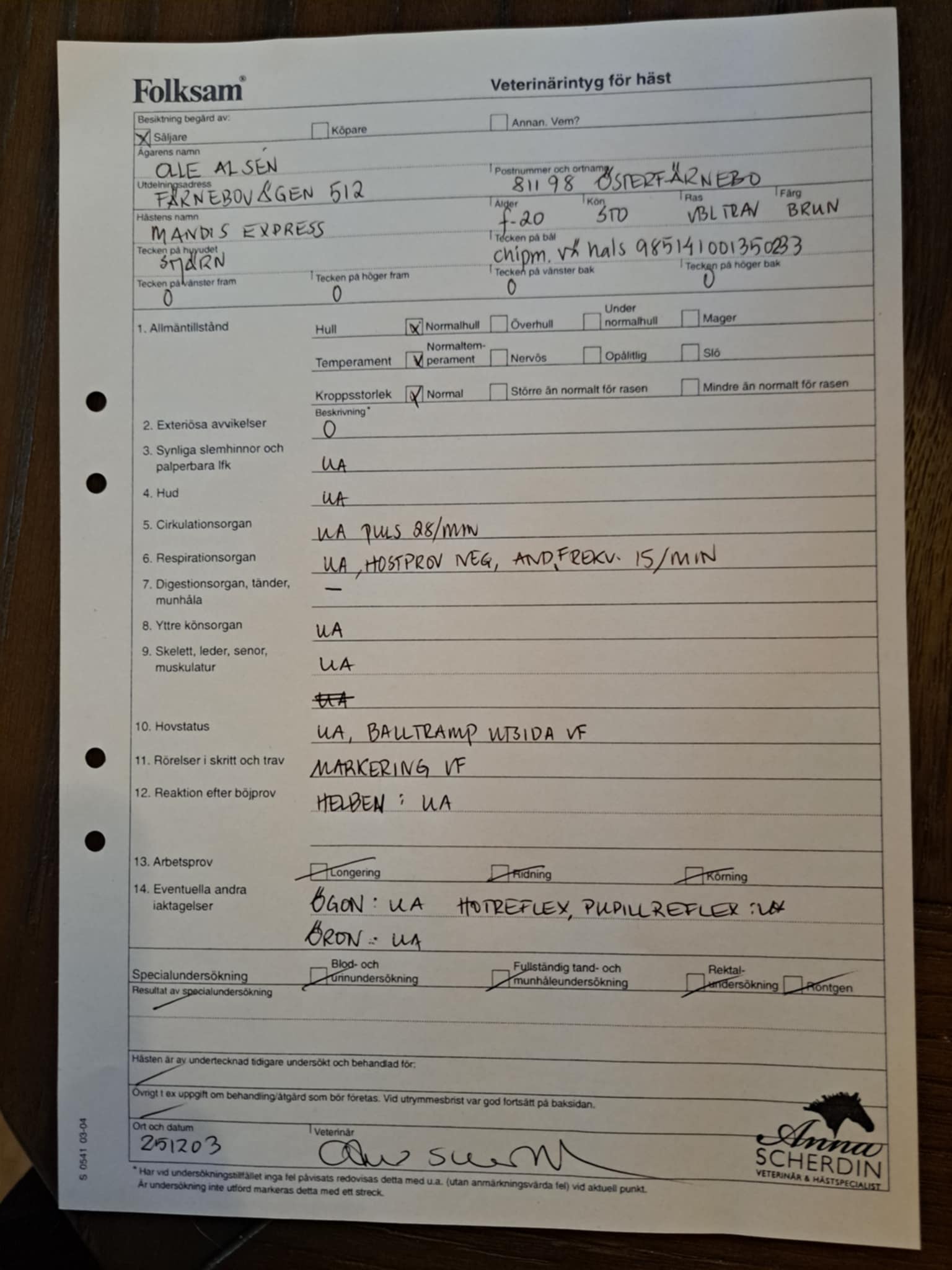 Olle Alsén: "Mandis Express kom till oss i slutet på sommaren. Hos oss har hon gått på utedrift men fungerat bra på box i tidigare regi. Hemma på gården är hon snäll i all hantering. På travet har hon varit betydligt piggare. I tidigare regi är hon mycket riden och skulle kunna funka i monté"
