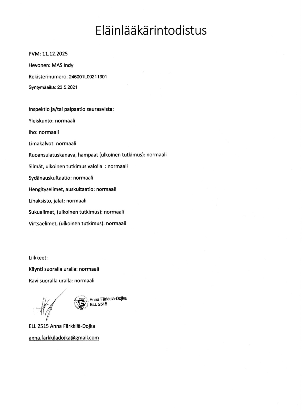 Owners Statement: Mas Indy är en fyraårig valack med god härstamning säljes på grund av att leasingavtalet upphör. När man hittar rätt balans för honom kan han vinna travlopp. Ur samma mor kommer även Stoneisle Vertigo, som på senaste tiden har presterat mycket bra. Mer info från ägare Timo korvenheimo +358443025290