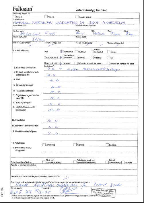 Henrik Thomsen: "Natural Frö er travsikker som resultaterne viser – hurtig fra start – rolig reel og omgængelig men lider en lille smugle af mild til moderat astma. Er meldt til alle storløb i Sverige. Inkl. præmiechanchen. Sælges grundet ophør med sporten."