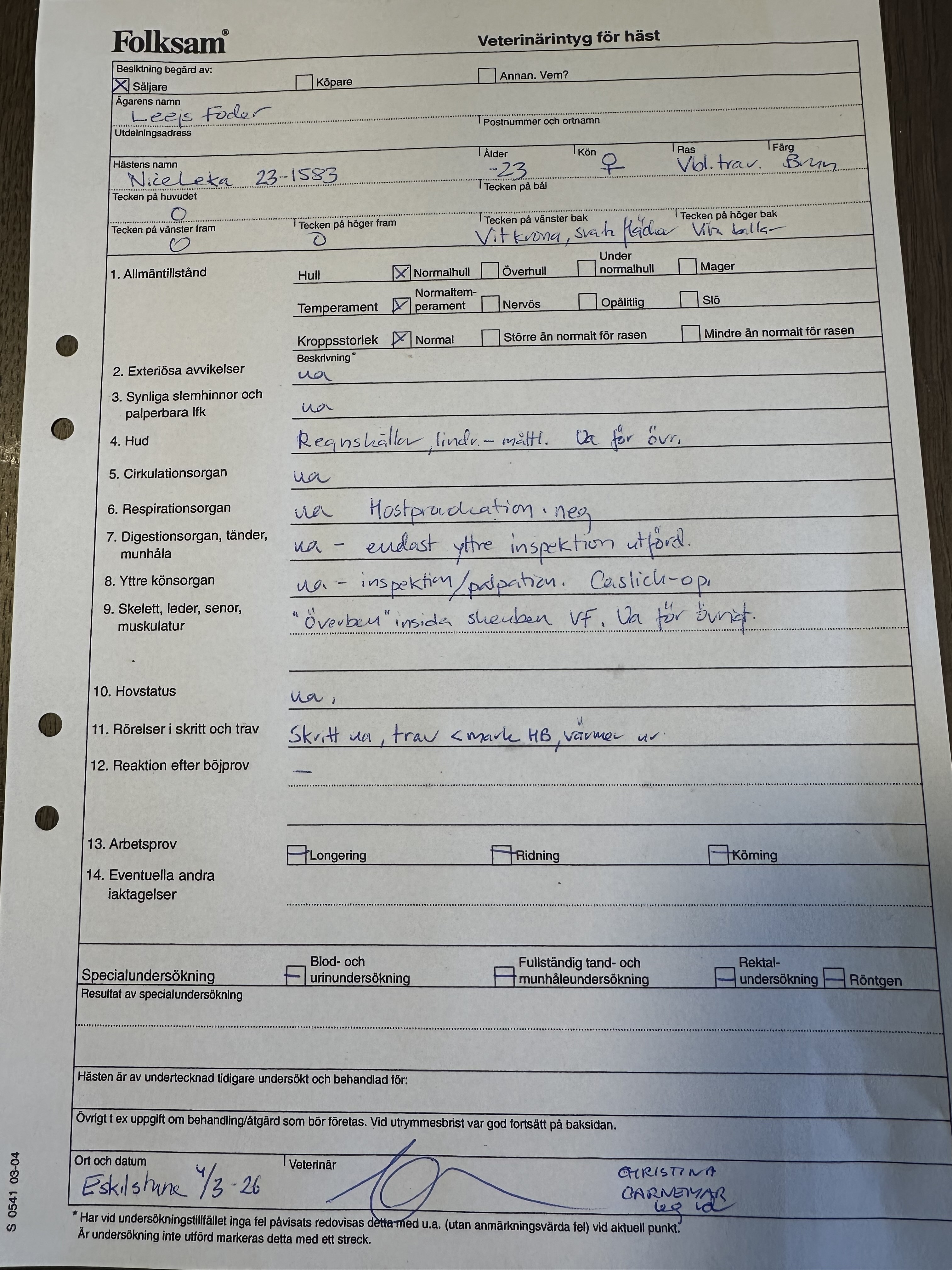 Jörgen S Eriksson: ”Nice Leka har varit hos mig sen i höstas. Exteriört väldigt fin och sympatisk häst. Pappa Hohneck ligger just nu trea bland fadershingstarna för tre- och fyraåriga hästar i Frankrike. Endast Face Time Bourbon och Ready Cash ligger före. Mödernet går tillbaka till elitstoet Piglet. Säljs då hon blir sen till start och ägaren har många hästar."