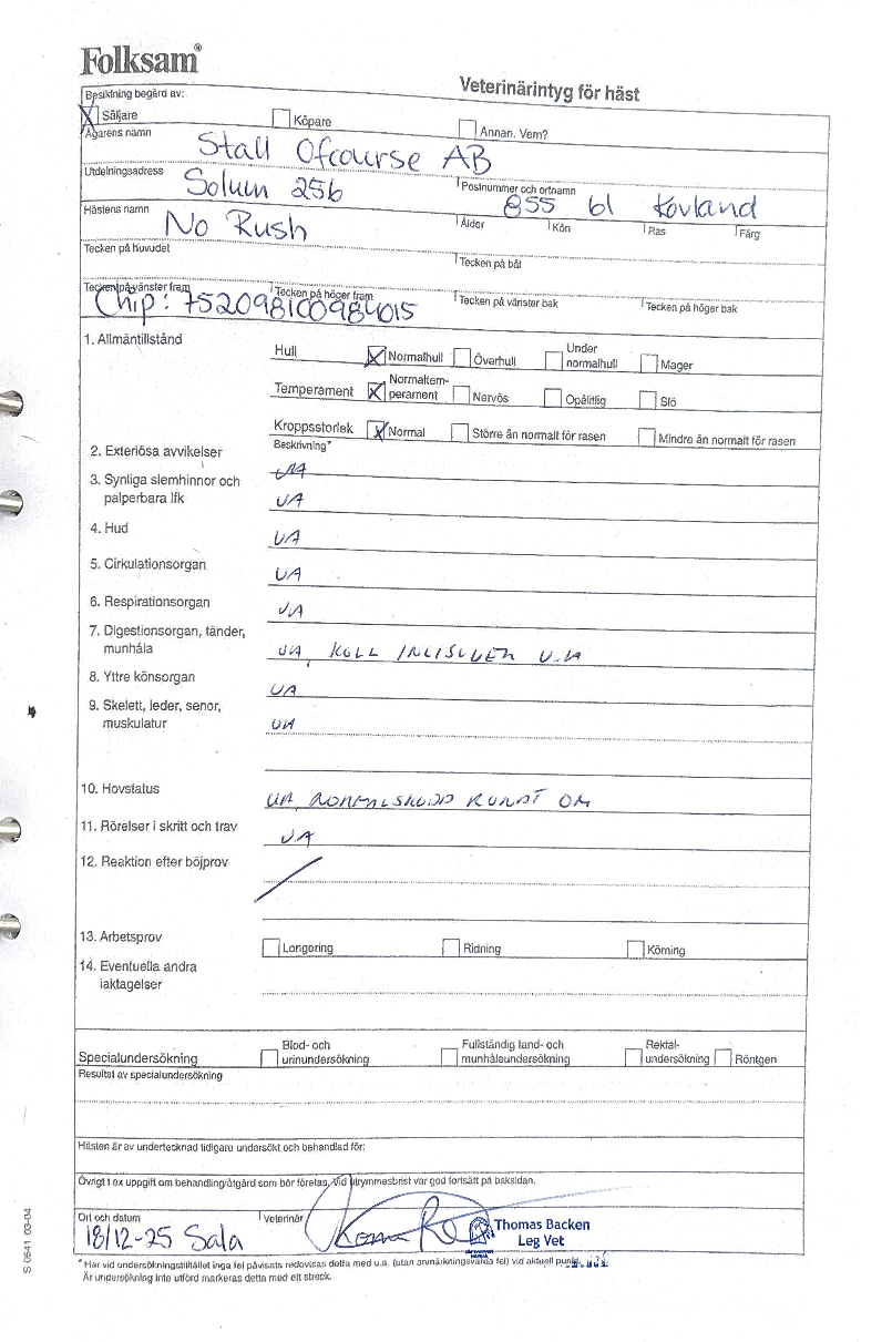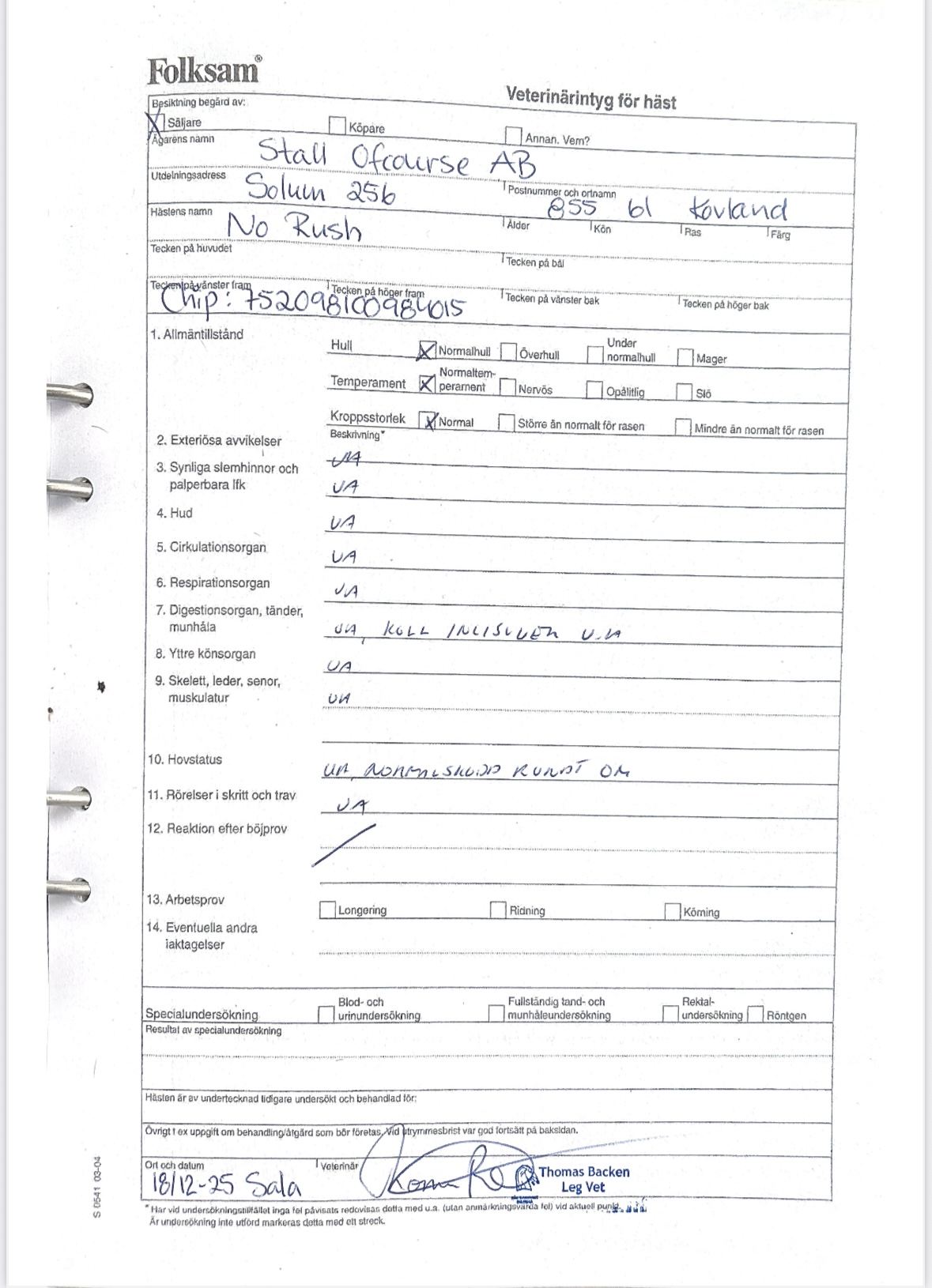 Oskar J Andersson: ”No Rush är en energisk kille som kräver en något rutinerad kusk. Han inledde sin tävlingskarriär mycket bra med en andraplats på 15-tid full väg. Tyvärr har vi inte fått honom att fungera lika bra sedan dess och någon annan får prova.”
