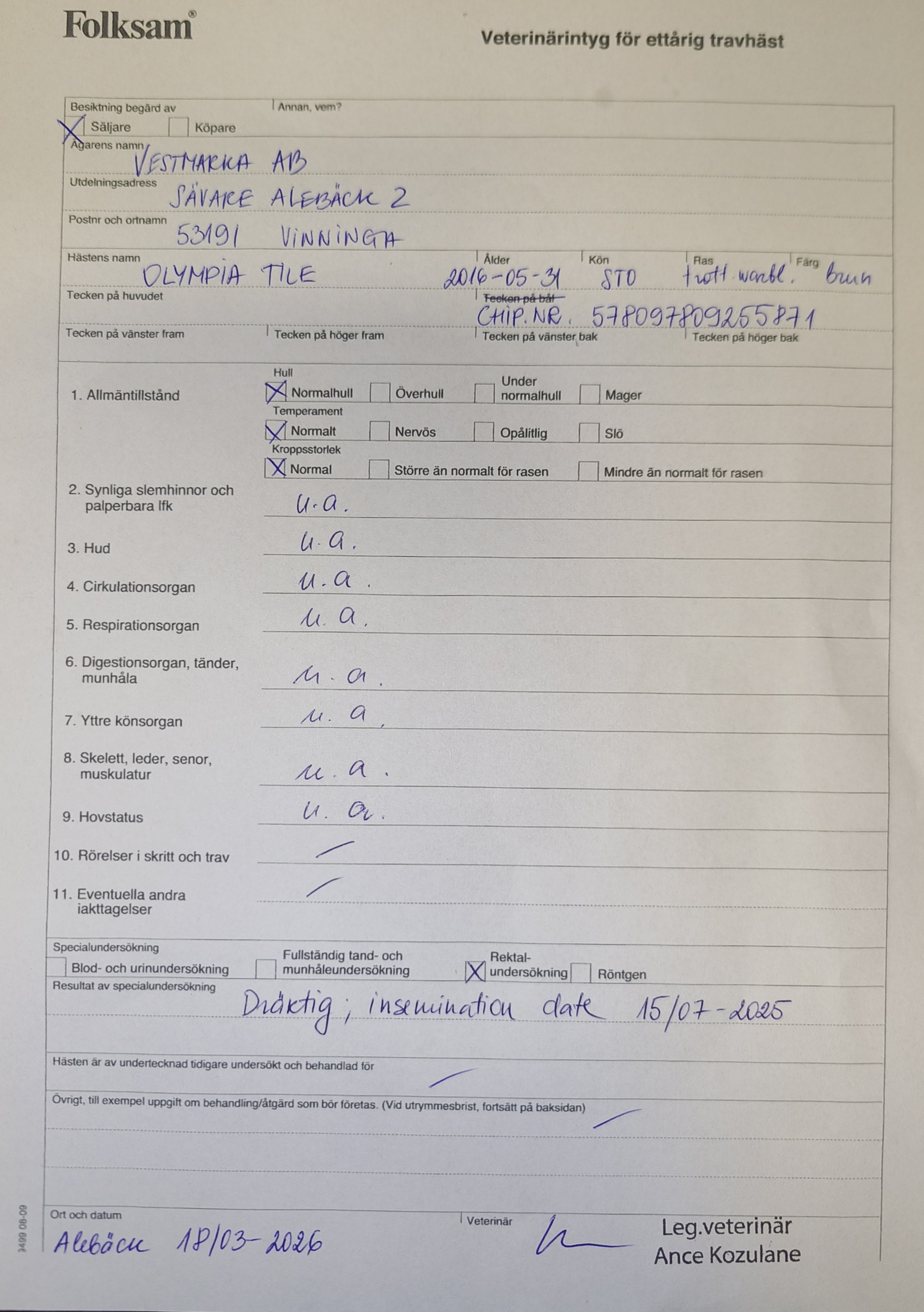 Olympia Tile är ett tioårigt fölsto efter Muscle Hill. Hon är dräktig med Maharajah och har ett beräknat földatum om 14 juni 2025. Levande föl-avgiften på 85.000 SEK + moms betalas av köparen.