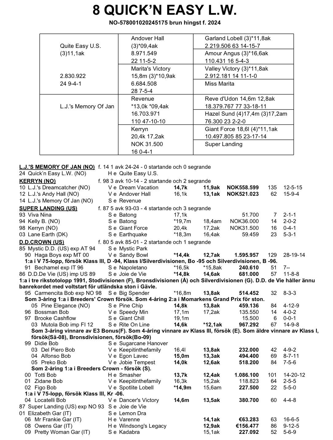 Quick'n Easy L.W. är en mycket flott och trevlig tvåårig hingst, han har fin benställning och rör sig väldigt bra. Välmusklad med en stark bakdel. Snäll att köra och går mängdträning.