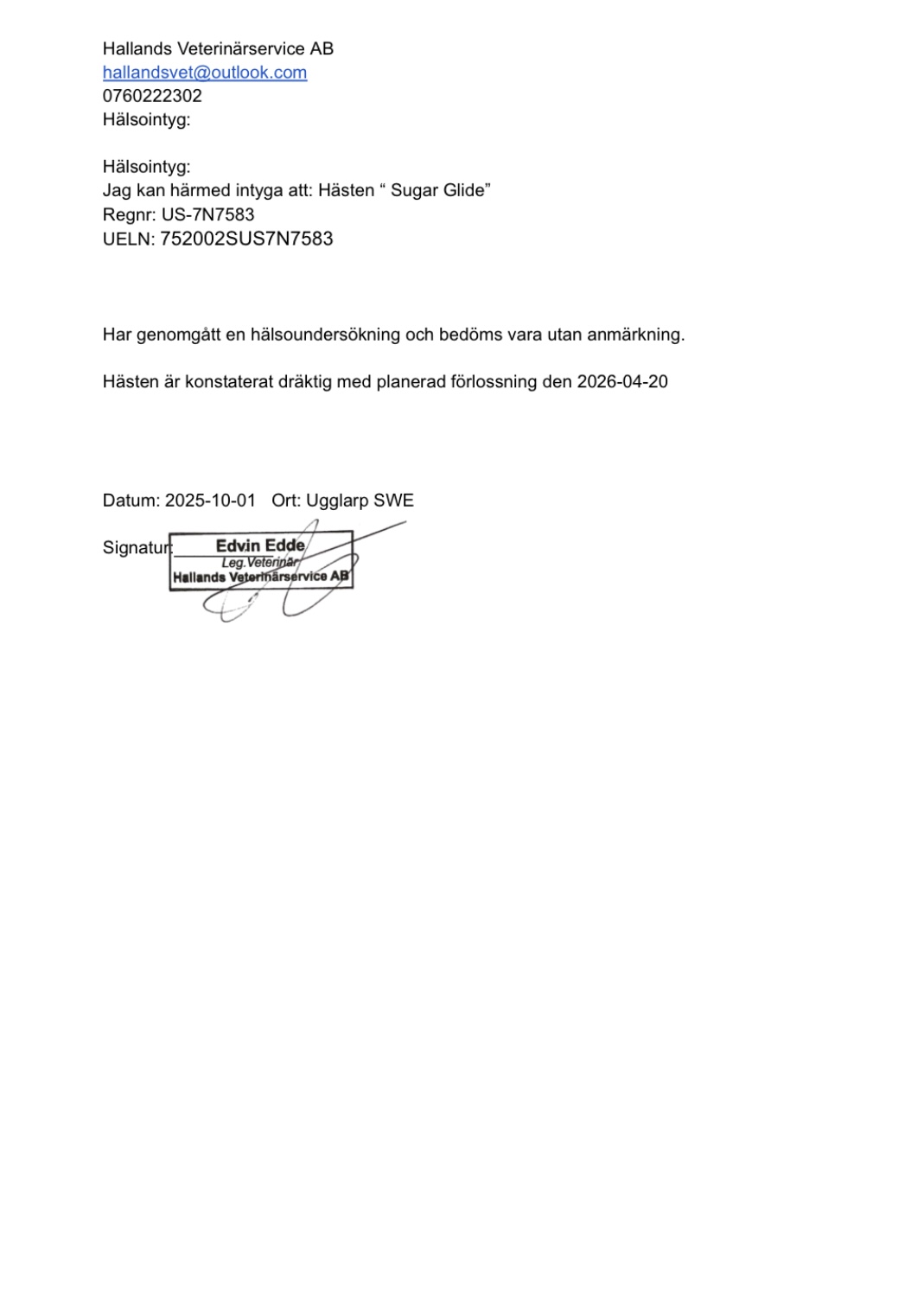 Sugar Glide är en mycket fin modell, mäter 1,58 i mankhöjd. Exteriört mycket fin. Snäll i all hantering.