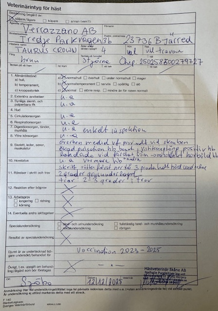Kommentar delägare Glenn Strömberg: "Taurus Crown såg lysande ut i onsdags och vann med gott om krafter sparade på 1.13,2/1640a där han avslutade 1.10,6 sista 500. Det var den överlägset snabbaste avslutningen under hela tävlingsdagen. I den näst senaste starten hade han lite problem med halsen och där gjorde han sig inte rättvisa. Det här är en väldigt fin starthäst där man kan anmäla direkt till rikstoton, om man så önskar. Taurus Crown är extremt startsnabb och reglerbar och har aldrig varit drabbad av någon skada. Noterbart är dessutom att mammans avkommor (diplomstoet Xena Brick) har levererat även som fem och sexåringar. Anledningen till att vi säljer är att vårt ägargäng endast satsar på yngre hästar och vill utmana allt mer i årgångsloppen. Här finns verkligen ett tillfälle att förvärva en välstammad och sund häst som står billigt inne i sin klass. Dessutom med bevisad form!"