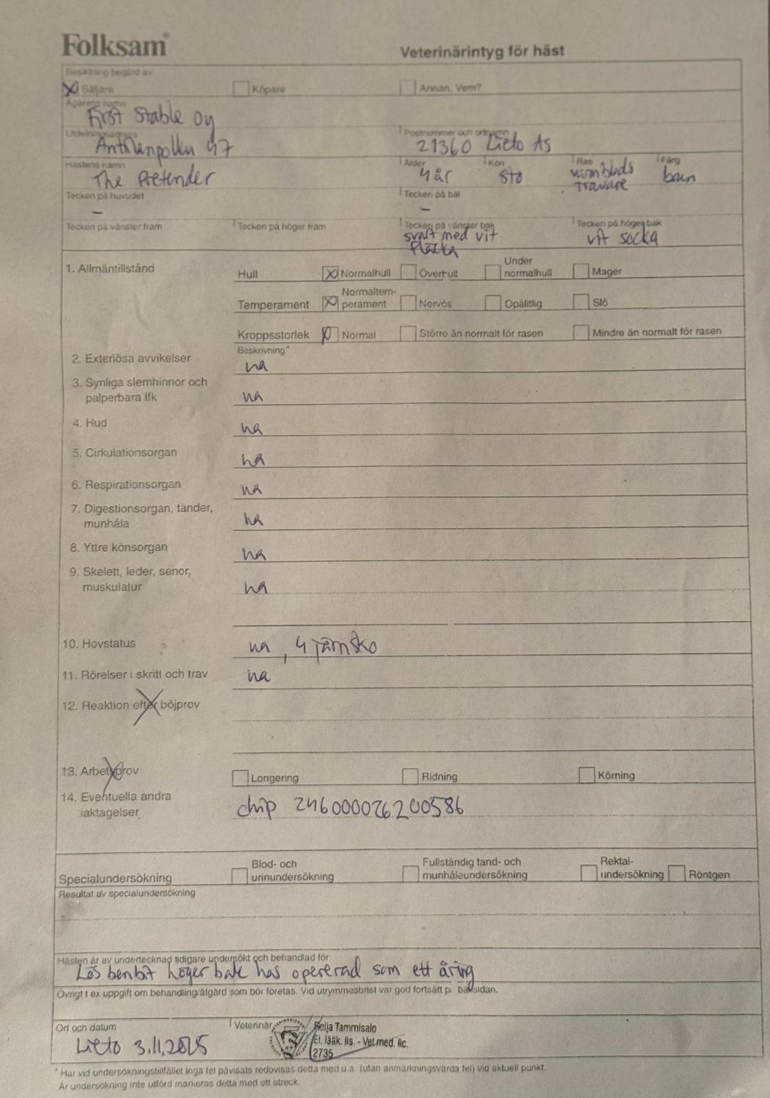 Kenneth Danielsen: “The Pretender är ett fint 4-årigt sto, cirka 164 cm. Hon har varit i full träning sedan hon var ettåring och har inga sen- eller gaffelbandsskador. Hon kan ibland trava sämre i svängarna och är fortfarande i växt, men har en bra härstamning med tanke på framtida avel. Den som hittar rätt balans i hästen kan få en riktigt fin tävlingshäst. Lungor och hjärta är i mycket gott skick."
