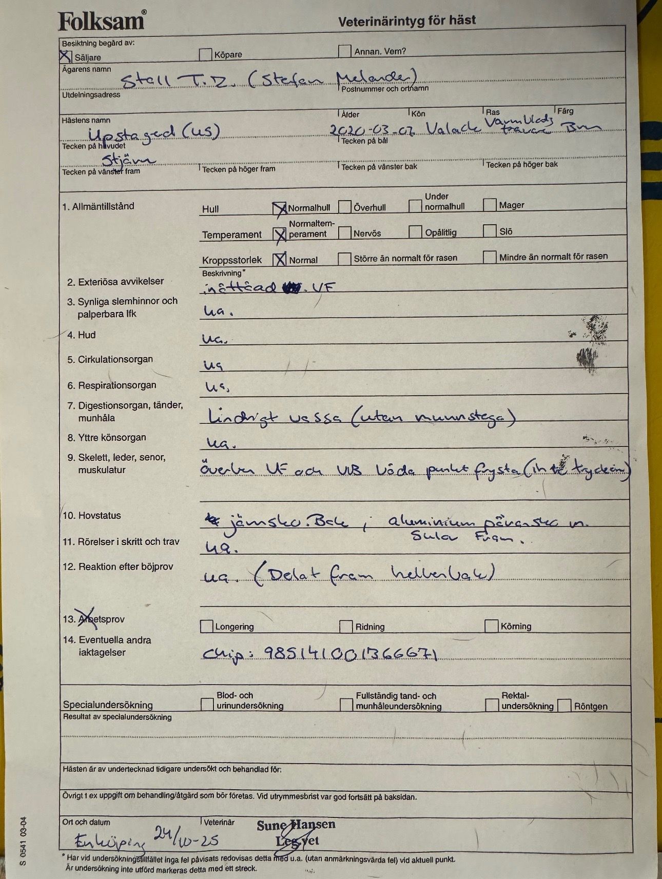 Observera att Upstaged nyligen varit tjock på gaffelbandet vänster bak, men det är fint igen enligt nytt intyg.