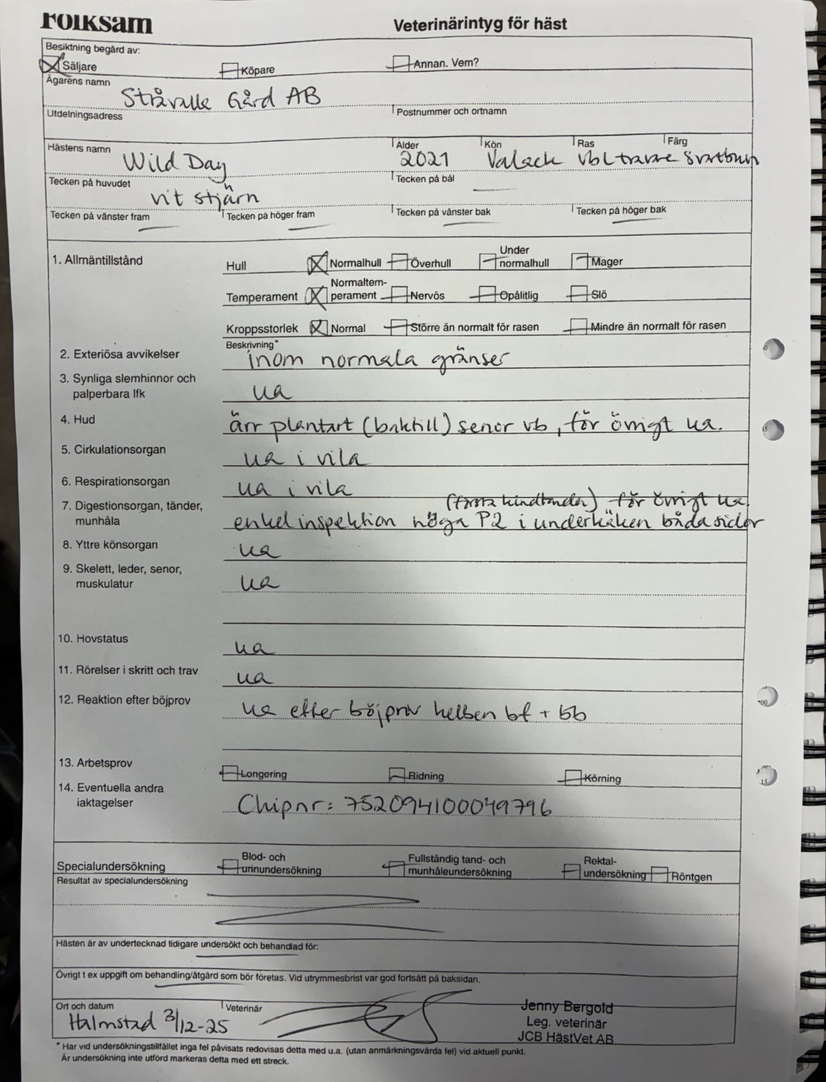 Wild Day är en fyraårig valack efter Crazed som tidigare lämnat Tumble Dust, Tjacko Zaz, Antonio Tabac och Eder Bob.