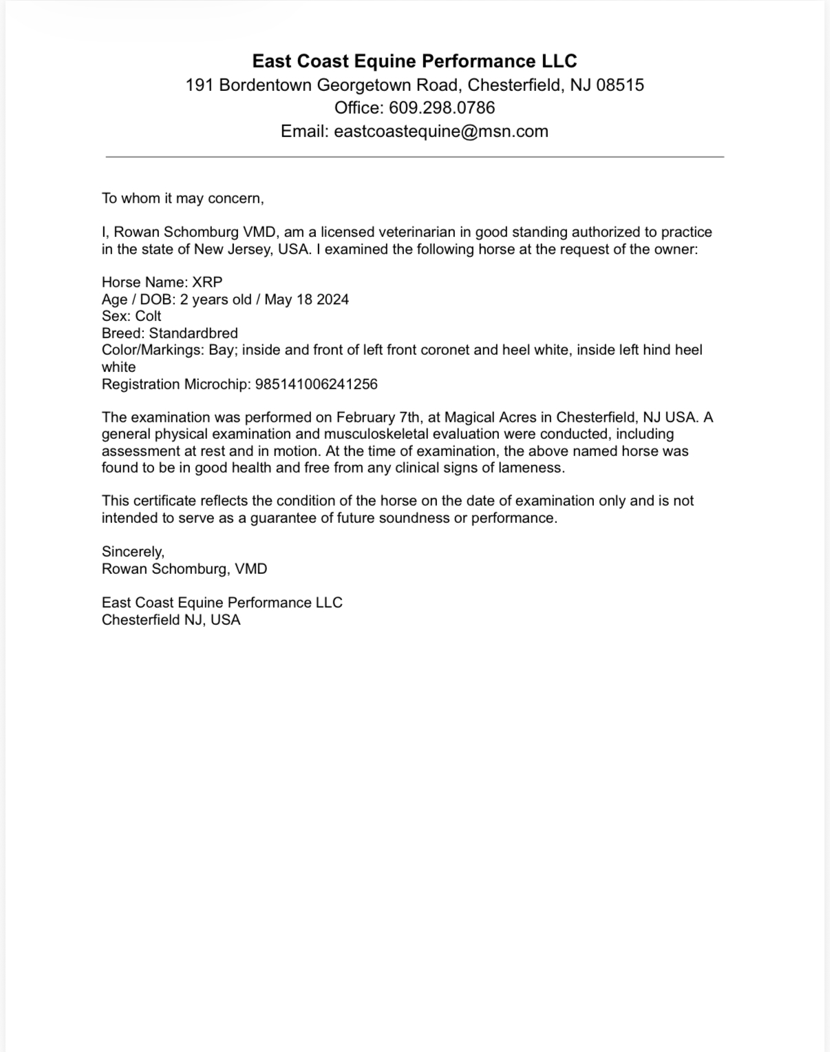 XRP är en tvåårig hingst efter Calgary Games och Divine Kronos, modern är syster med Aetos Kronos. XRP har tränats sedan i mitten av oktober och har tränat sex dagar i veckan. För dagen går han 1.45/1600 meter med bra puls men hästen kommer att behöva ytterligare tid för att bli stark nog för sin aktion och den tiden finns inte på samma sätt i USA. Han skulle kunna vara årets köp för kunder i Sverige.