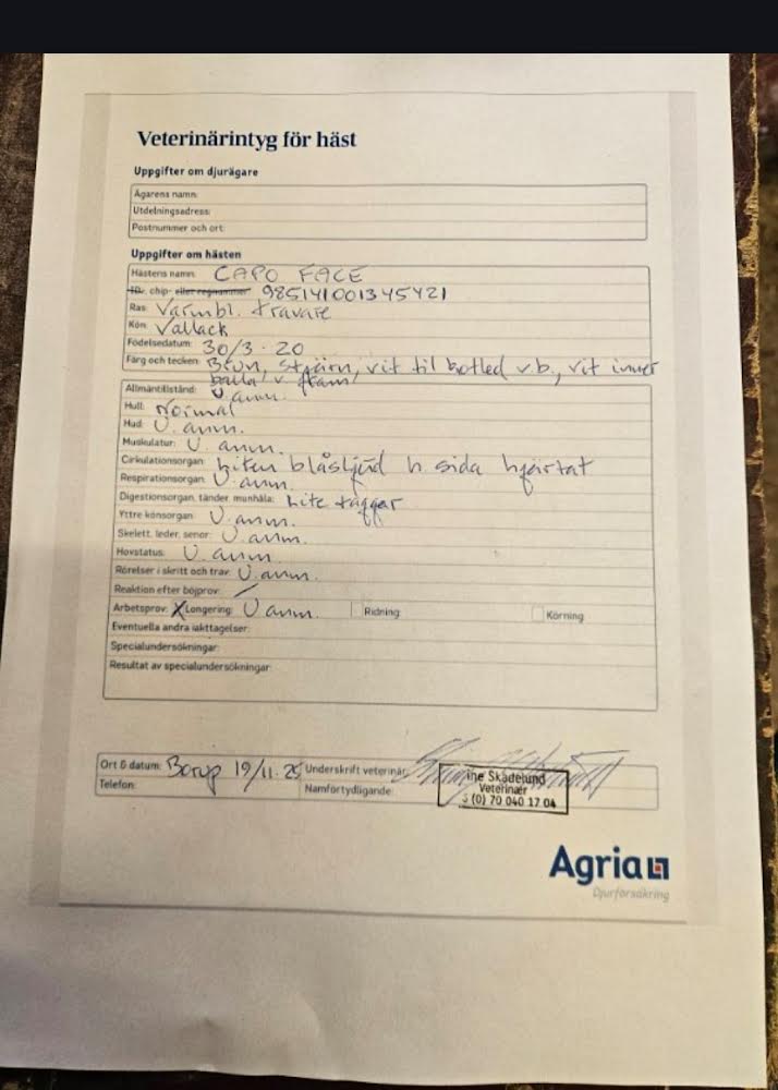 Jörgen Lorentzen: ”Capo Face är en femårig valack efter Bold Eagle. Modern Iona L.B. har bland annat lämnat Mosaique Face (14,4 miljoner) samt Upset Face (2,5 miljon). Cape Face är snäll och trevlig i allt. Finns inga problem med honom. Han är startklart och det finns potential i honom.”