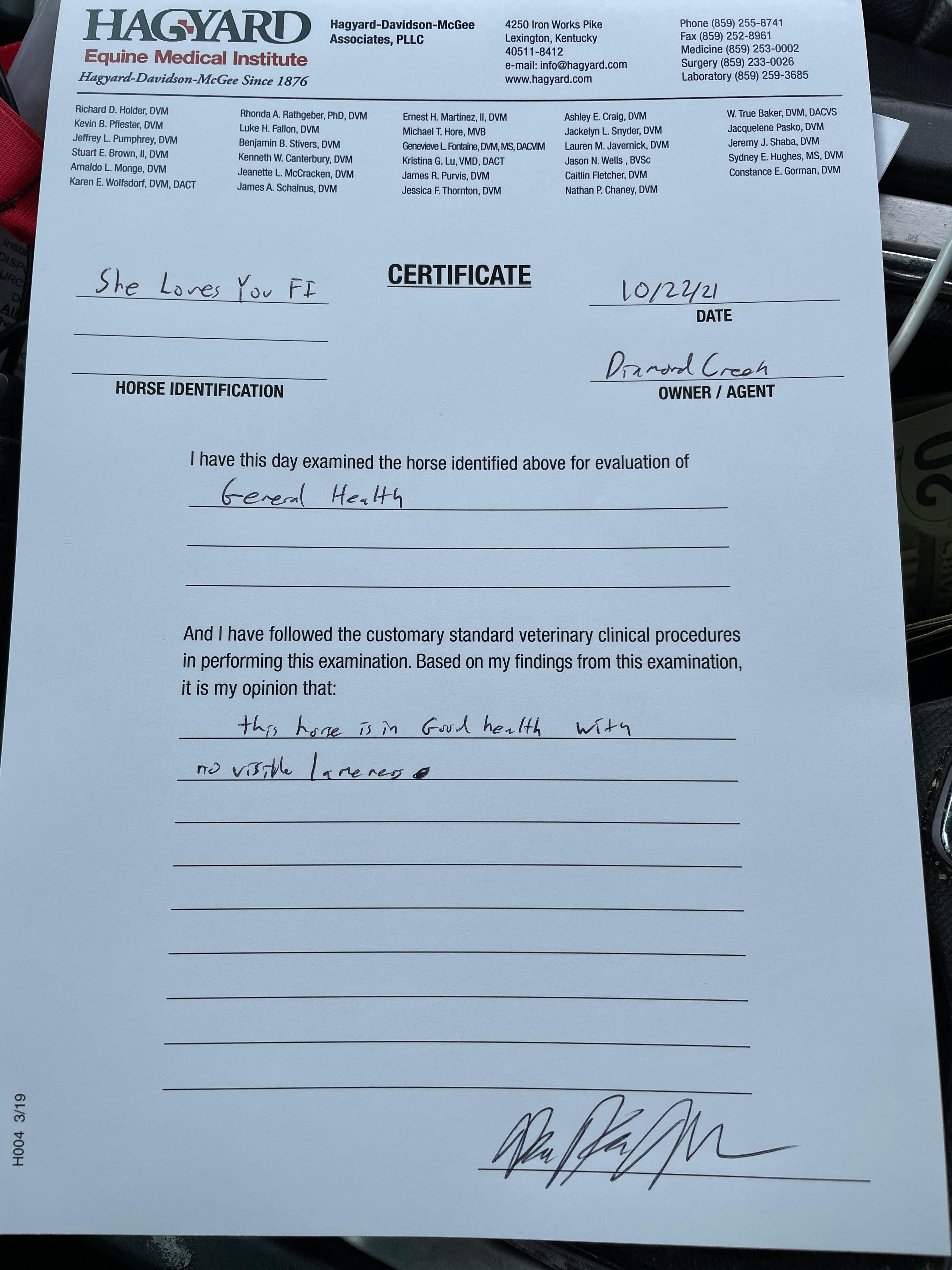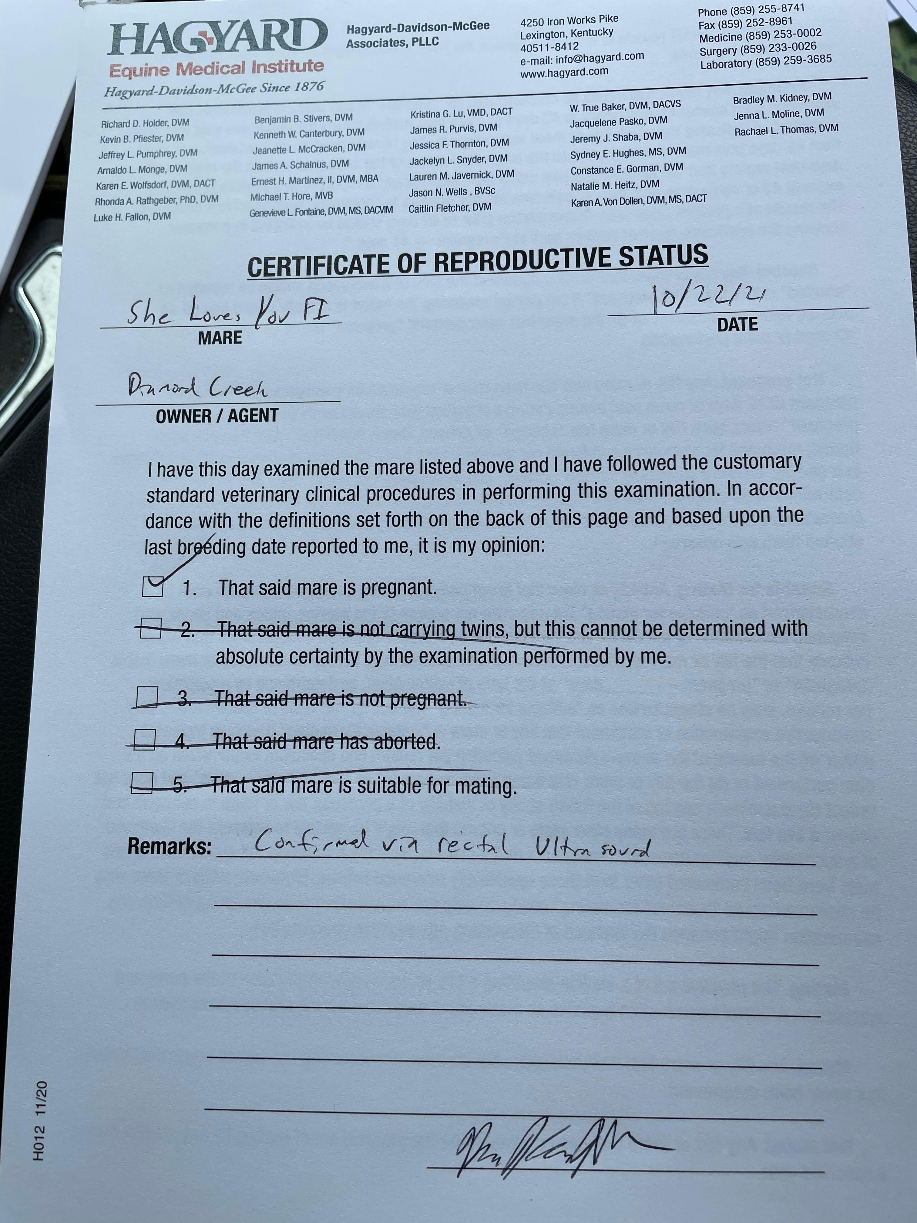 Dräktig med Gimpanzee och det är scannat till en hingst, beräknat földatum 18 april 2022. Säljaren betalar levande fölavgift om 30.000 USD, motsvarande cirka 260.000 SEK.